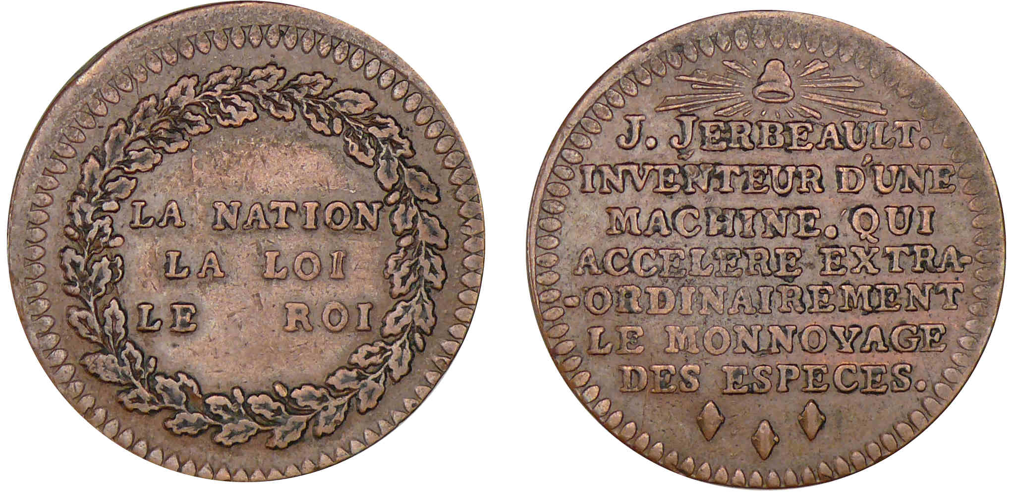 Revers : R/ J. JERBEAULT INVENTEUR D’UNE MACHINE QUI ACCELERE EXTRAORDINAIREMENT LE MONNOYAGE DES ESPECES.