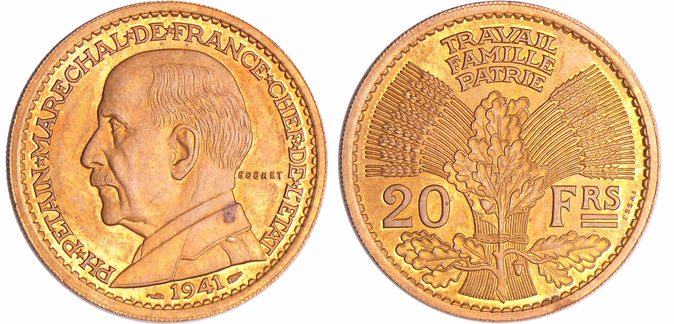 Etat Français (1940-1944) – Pétain – 20 francs 1941 essai piéfort de Cochet
