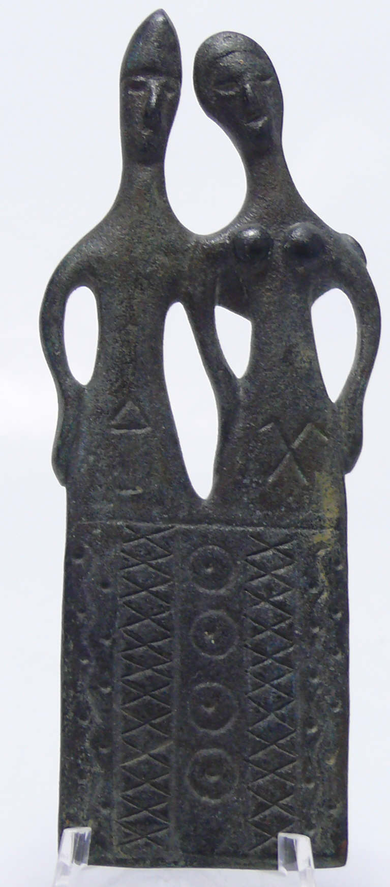 Avers : Belle plaque en bronze représentant un homme et une femme, les jambes recouvertes de colonnes de frises géométriques. Dimensions : 110*45 mm.