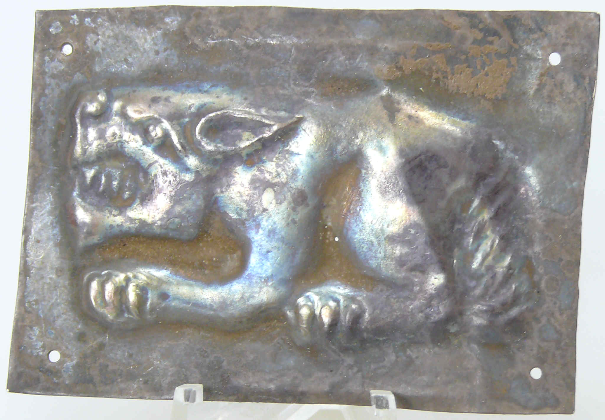 Plaque en argent de la civilisation Ordos, représentant un félin couché. 60×40 mm.