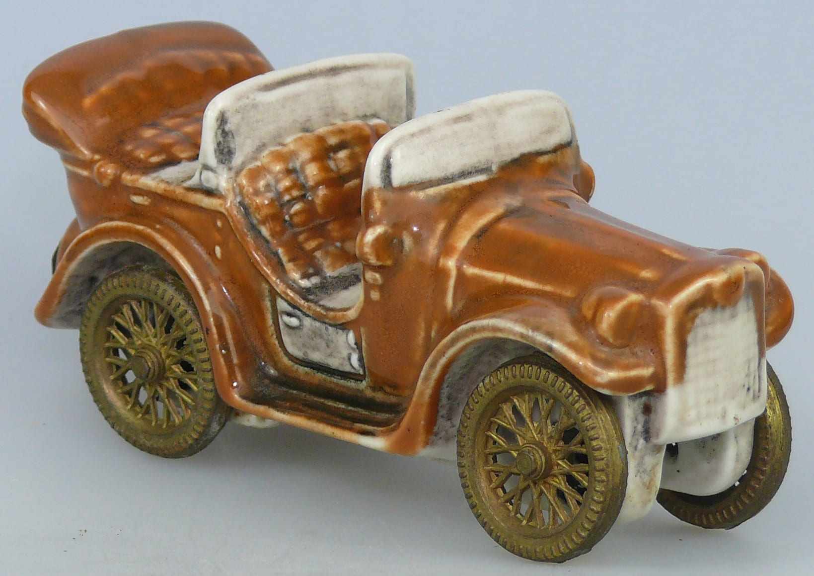 Revers : Very original ceramic liqueur bottle in the shape of a jalopy painted white and orange-brown with moving wheels. The ceramic bottle is an Italian production by Borghini Lacrima Christi from 1912.