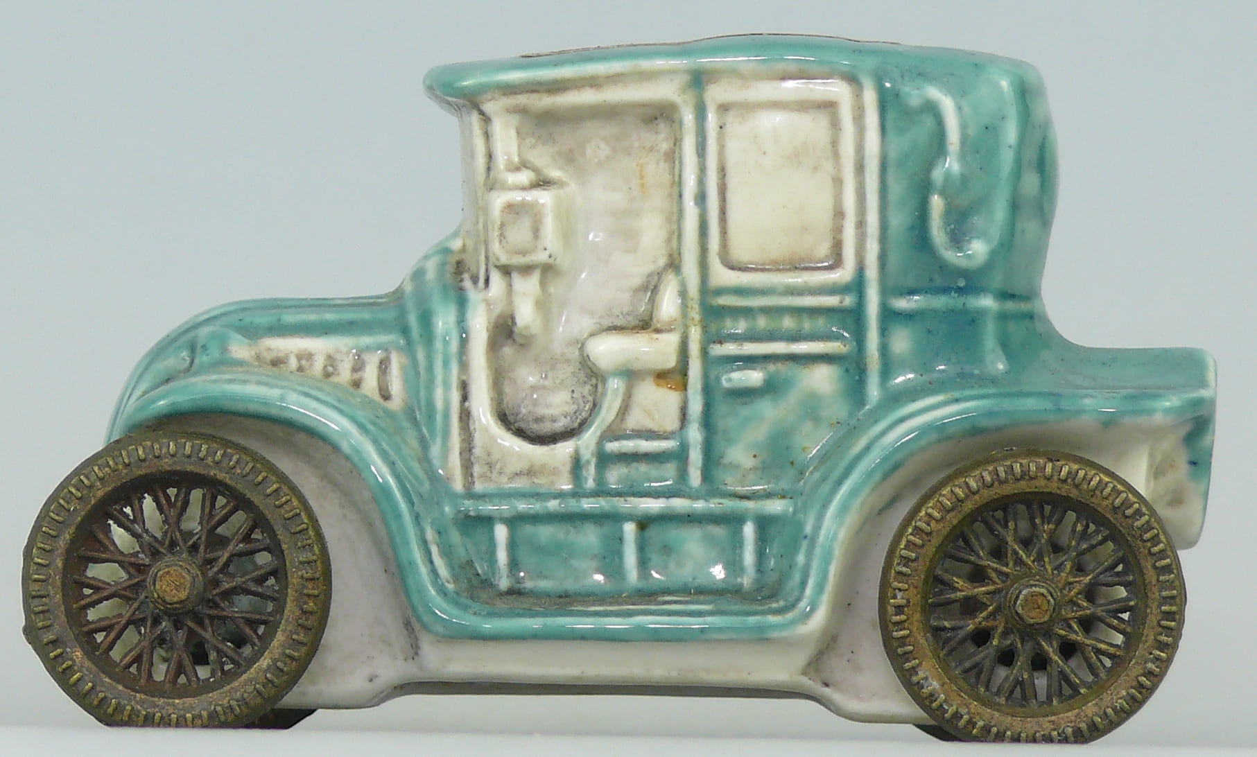 Revers : Very original ceramic liqueur bottle in the shape of a jalopy painted white and blue and representing a Renault with moving wheels. The ceramic bottle is a Borghini Lacrima Christi production from 1910.