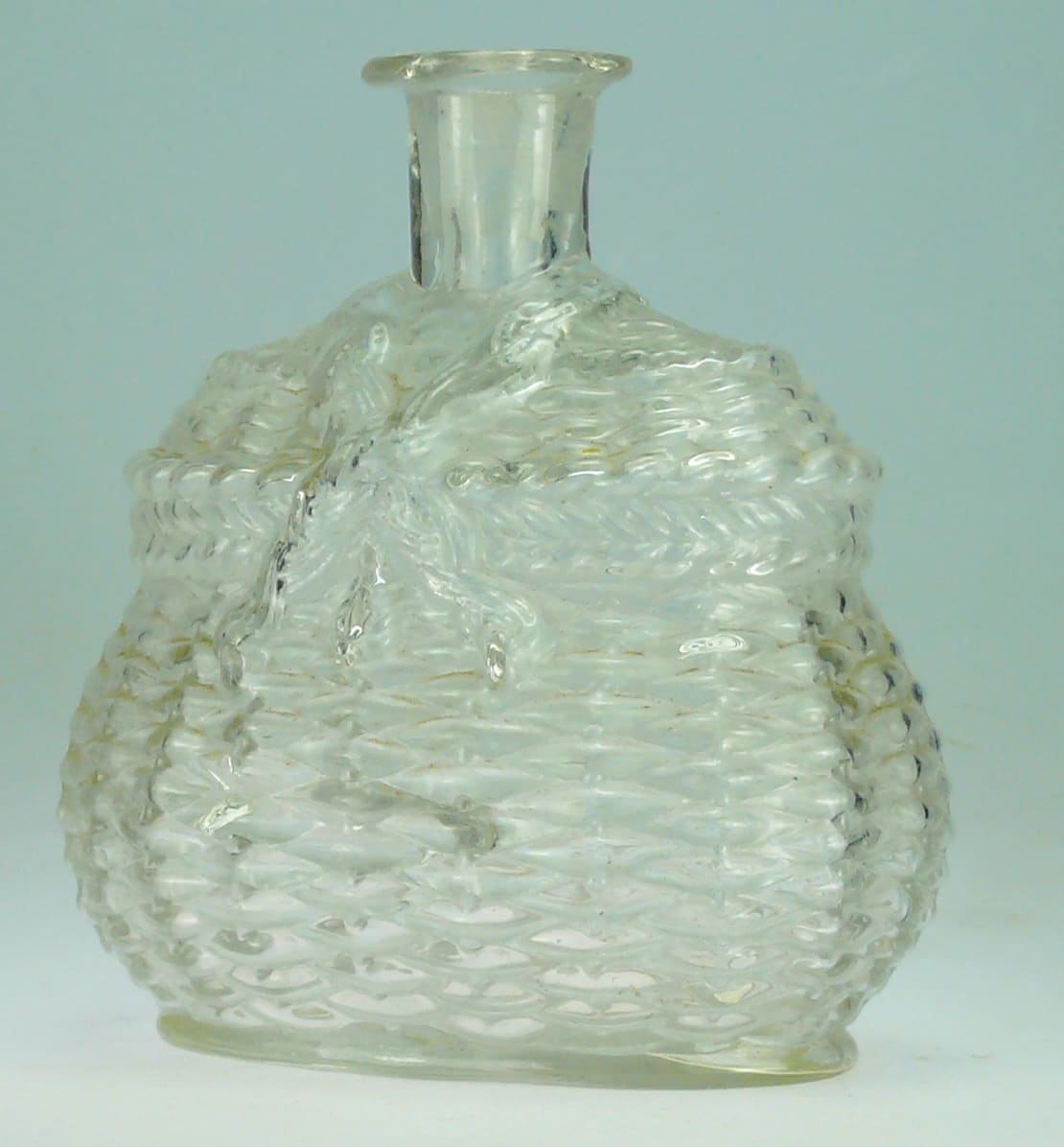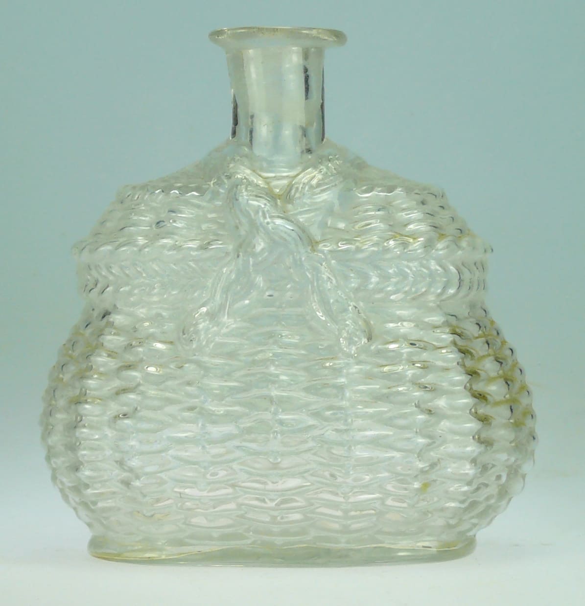 Avers : Beau flacon Legras en verre moulé à fond incolore, col court et bord évasé plat, la panse représentant un panier en osier. Manque le bouchon. Bouteille inscrite au dessous. Ce modèle apparait dans le catalogue Legras de 1895 et 1908 sous le numéro 133 et éxistait en contenance de 1/2 litre et 1 litre.