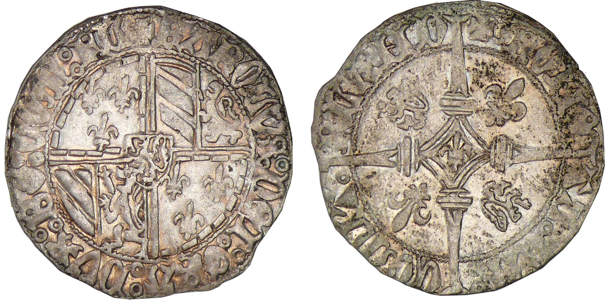 Revers : R/ + mONE-TA: nA: – COmIT – FLAND, ponctuation par annelets superposés. Croix longue pattée, portant dans un losange curviligne un lis en coeur, cantonnée de deux lions en 1 et 4 et de deux lis en 2 et 3.