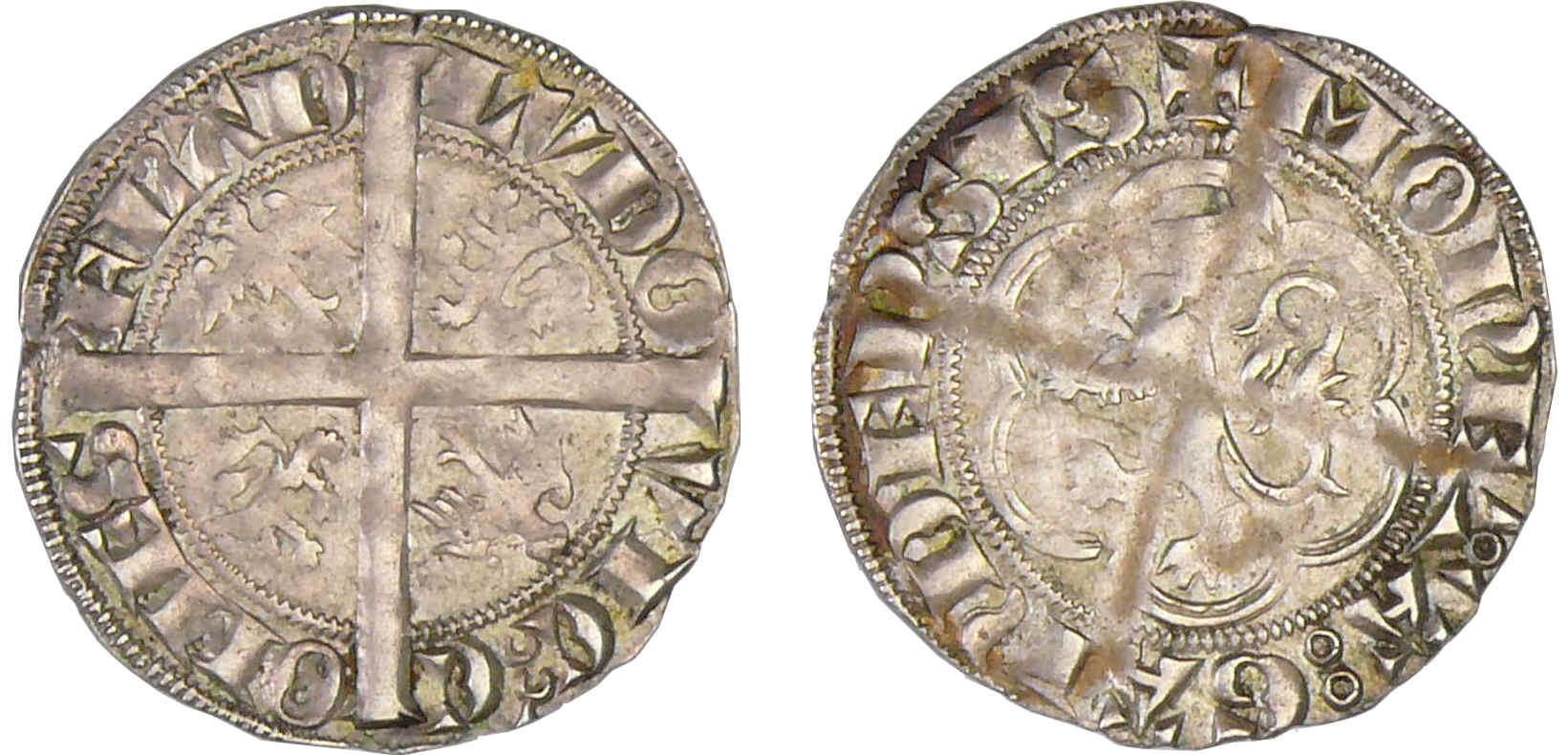 Avers : Louis 1er de Crécy (1322-1346). A/ LVDOVIC: COMES FLAD’. Croix coupant la légende, cantonnée de deux lions et de deux aigles monocéphales.