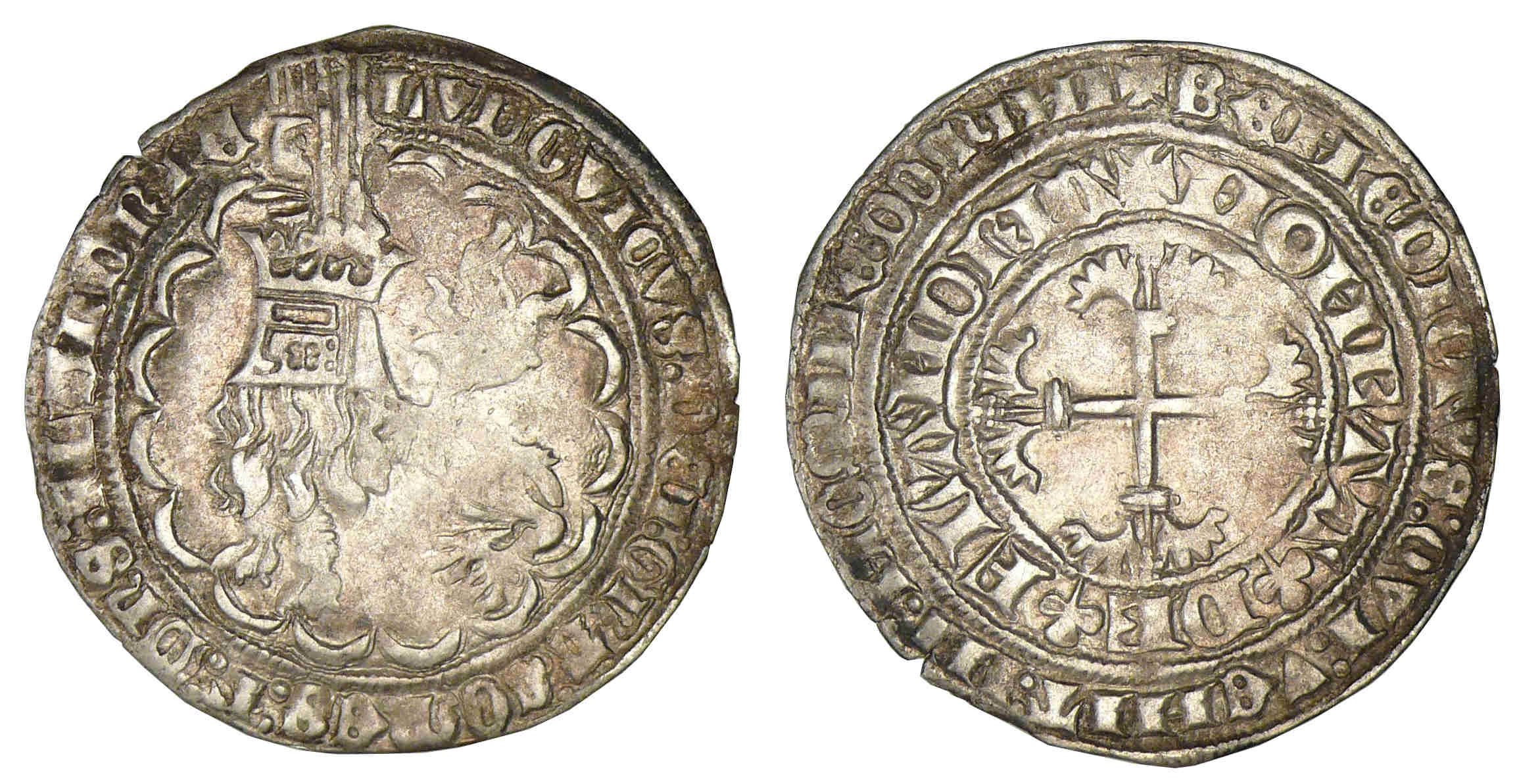 Louis II de Male (1346-1384). A/ LVDOVICVS: DEI: GRA: COmES: Z: DnS: FLAnDRIE. Lion assis à gauche, coiffé d’un heaume dans un polylobe.