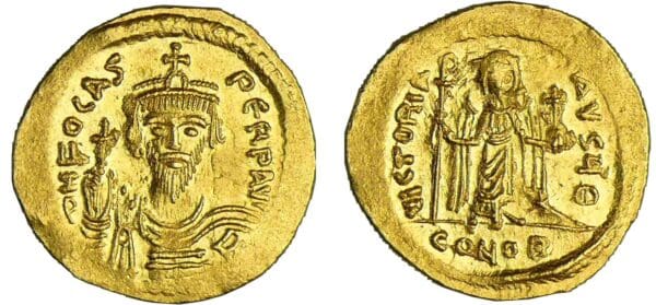 Avers : A/ d N FOCAS – PERP AVI. Buste couronné de Phocas diadémé et cuirassé de face, tenant un globe crucigère de la main droite.