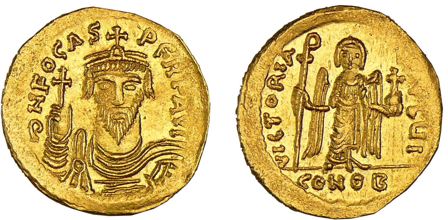 Avers : A/ d N FOCAS – PERP AVI. Buste couronné de Phocas, diadémé et cuirassé de face, tenant un globe crucigère de la main droite.