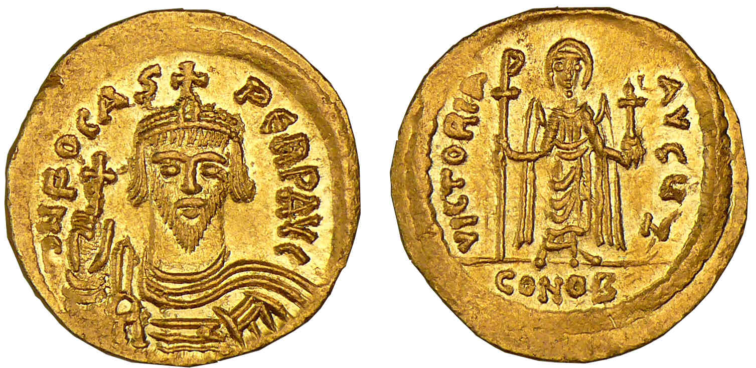 Avers : A/ d N FOCAS – PERP AVG. Buste couronné de Phocas, tenant un globe crucigère de la main droite.