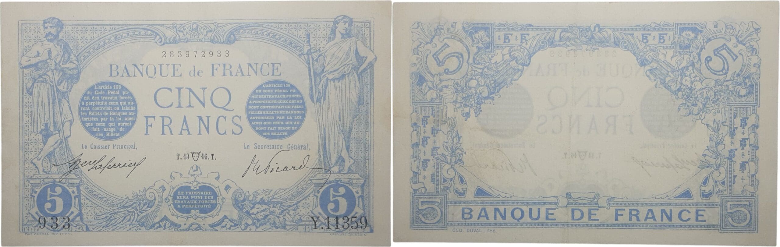 France – 5 francs (Bleu) Type 1905 – 17/04/1916