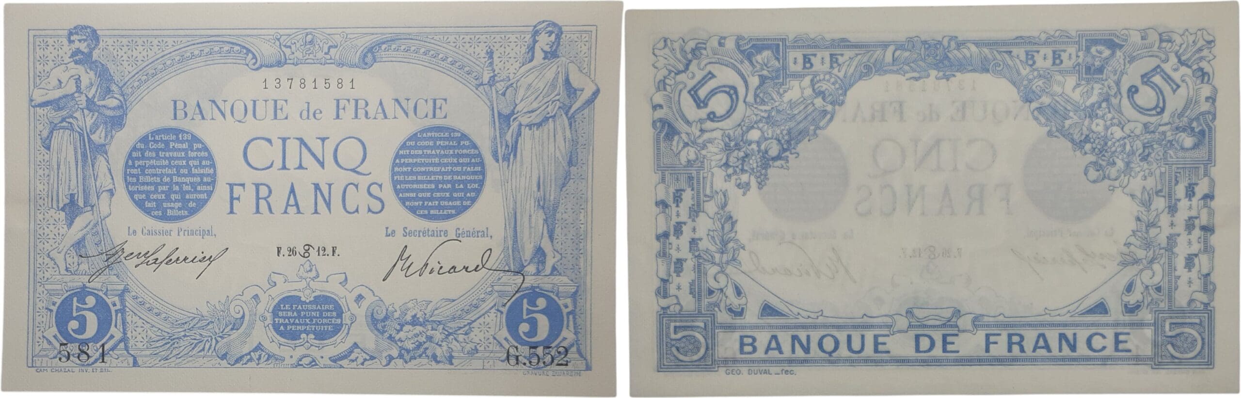 France – 5 francs (Bleu) Type 1905 – 26/06/1912