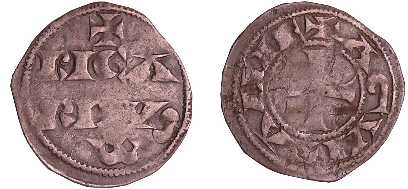 Avers : Richard Cœur De Lion (1189-1199). A/ RICARDVS en deux lignes. Au-dessus, une croisette et en-dessous, un oméga.