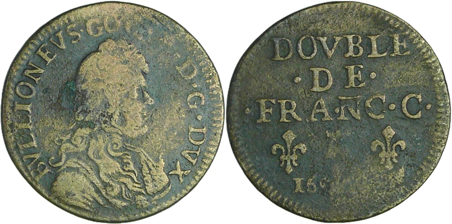 Revers : R/ DOVBLE / .DE. / .FRANC. C. en trois lignes dans le champ. Au-dessous, trois lis posés 2 et 1 portant en cœur une couronne. 16-83 en accostement du lis inférieur.