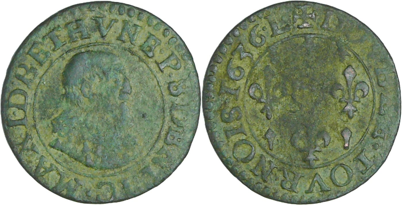 R/ + DOVBLE. TOVRNOIS. 1636. L. Ecu d’Henrichemont dans un champ de lis.