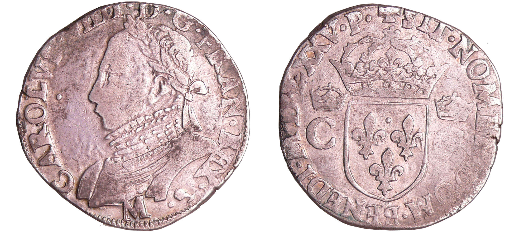 Avers : A/ CAROLVS. VIIII. D. G. FRANC. REX. Buste lauré et cuirassé à gauche. Atelier sous le buste.