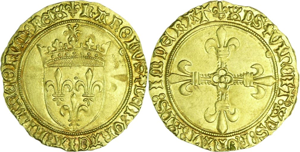 Avers : A/ (lis) KAROLVS• DEI• GRA• FRANCORVM• REX. Ecu de France couronné sous un soleil.