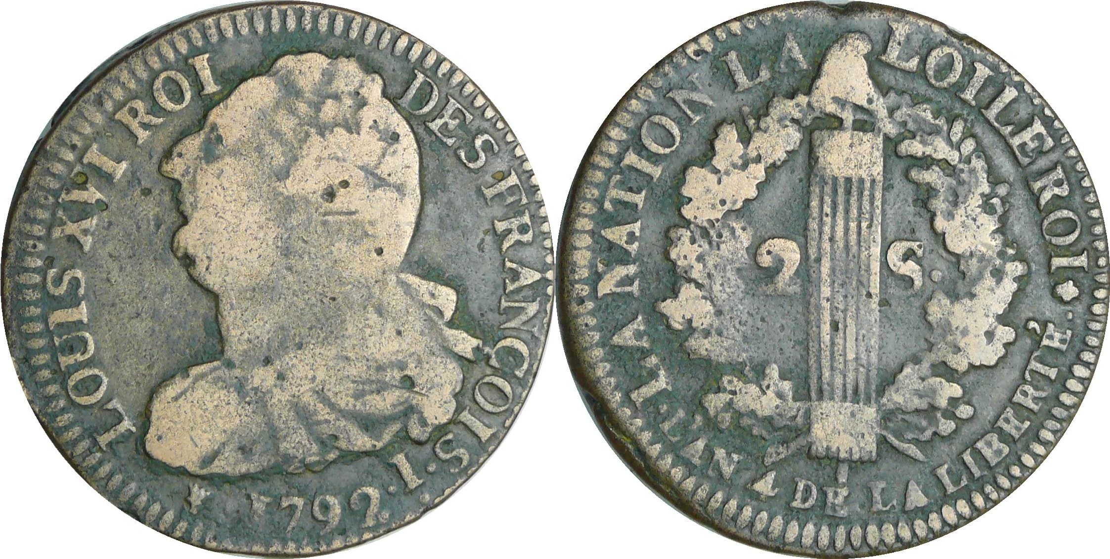 / France – Constitution (1791-1792) – 2 sols au faisceau type FRANCOIS – 1792 I (Clermont-Ferrand)