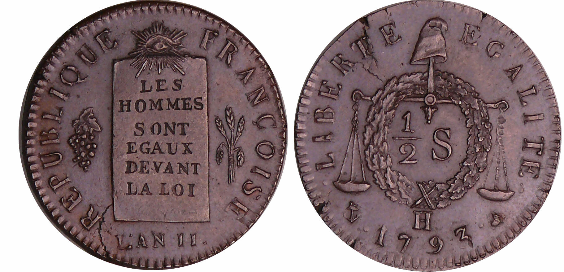 France – Convention (1792-1795) – 1/2 sol à la balance – An II – 1793 H (La Rochelle) refrappe