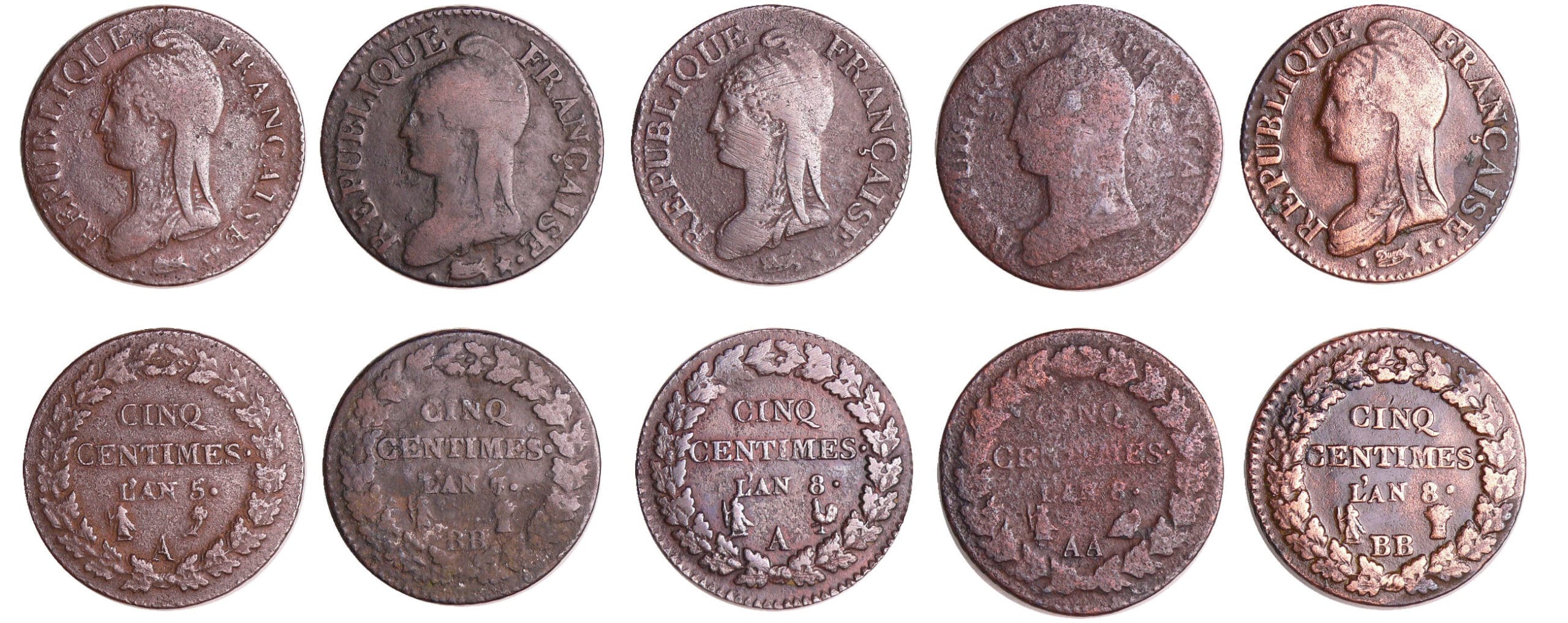 / France – Directoire (1795-1799) – 5 centimes Dupré – grand module – Lot de 5 monnaies