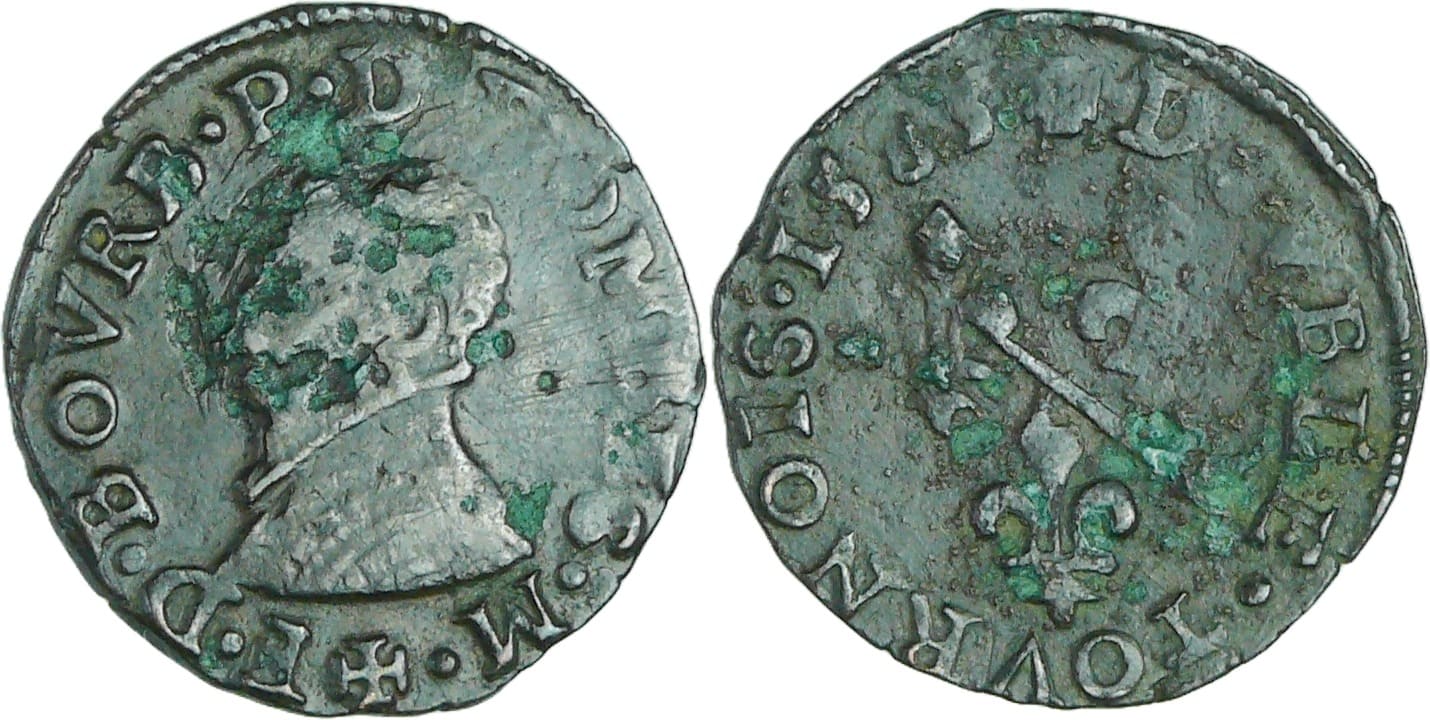 Revers : R/ + DOVBLE TOURNOIS (millésime). Trois lis barrés.