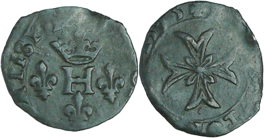 R/ + DNS ADIVT ET REDEM MEVS (millésime). Croix cantonnée de quatre couronnes.
