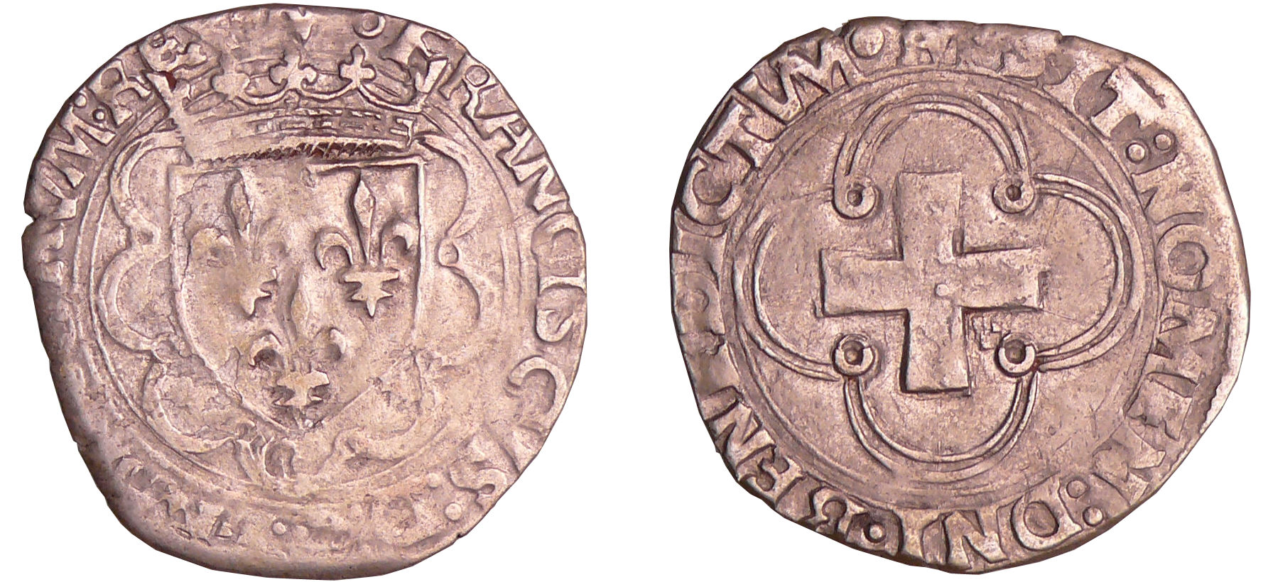 A/+ FRANCISCVS: DEI: GRA: FRANCORVM: REX. Ecu de France dans un double polylobe bouleté. Lettre d’atelier à la pointe de l’écu.
