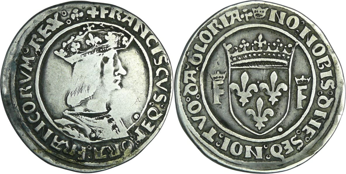 Avers : A/ + FRANCISCVS: DEI: GRA: FRANCORVM: REX: (trèfle). Buste du roi à droite, coiffé d’une couronne ouverte sur un chaperon.