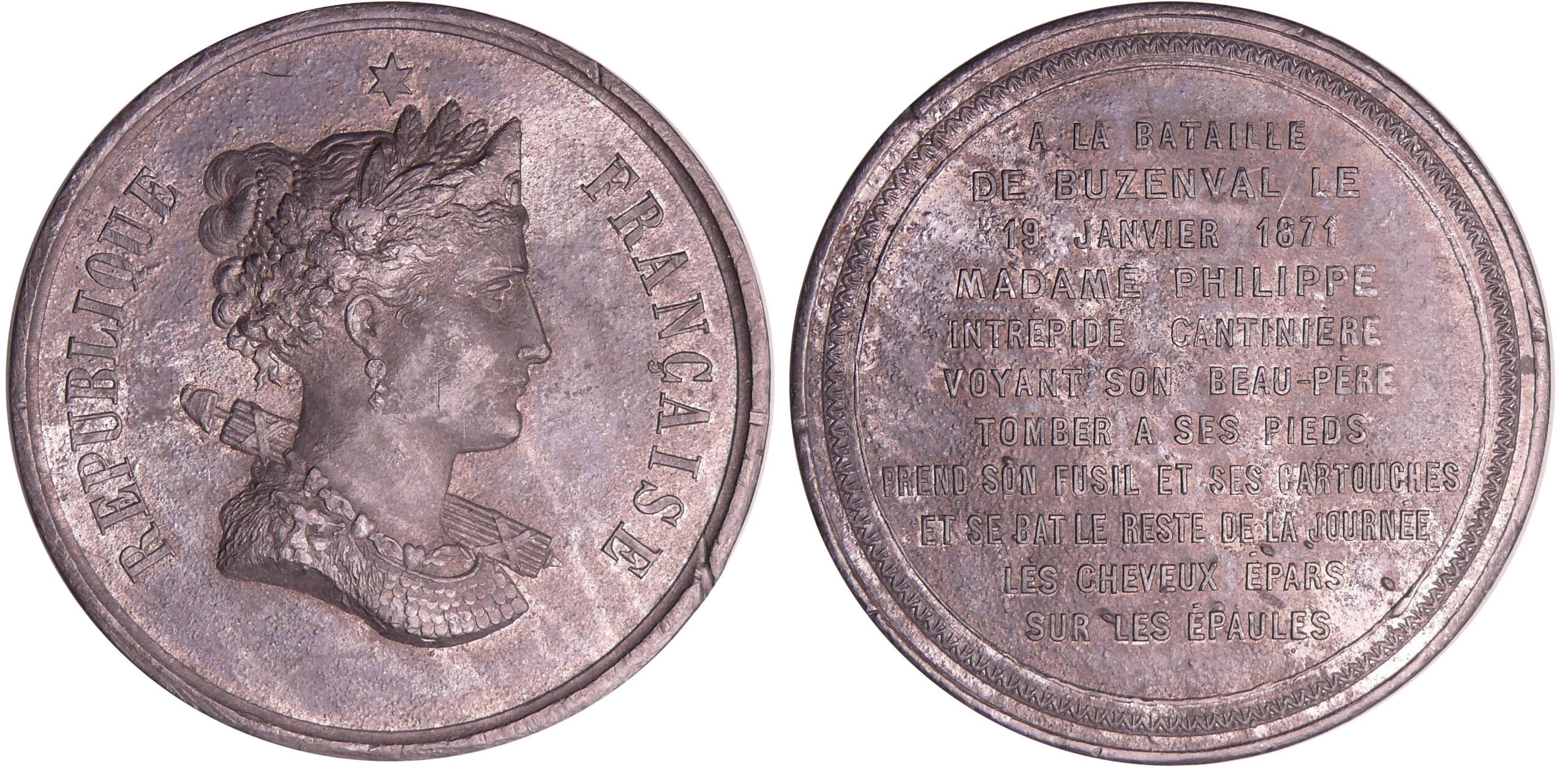 Revers : R/ A LA BATAILLE/ DE BUZENVAL LE/ 19 JANVIER 1871/ MADAME PHILIPPE/ INTREPIDE CANTINIERE/ VOYANT SON BEAU-PÈRE/ TOMBER A SES PIEDS/ PREND SON FUSIL ET SES CARTOUCHES/ ET SE BAT LE RESTE DE LA JOURNEE/ LES CHEVEUX EPARS/SUR LES EPAULES