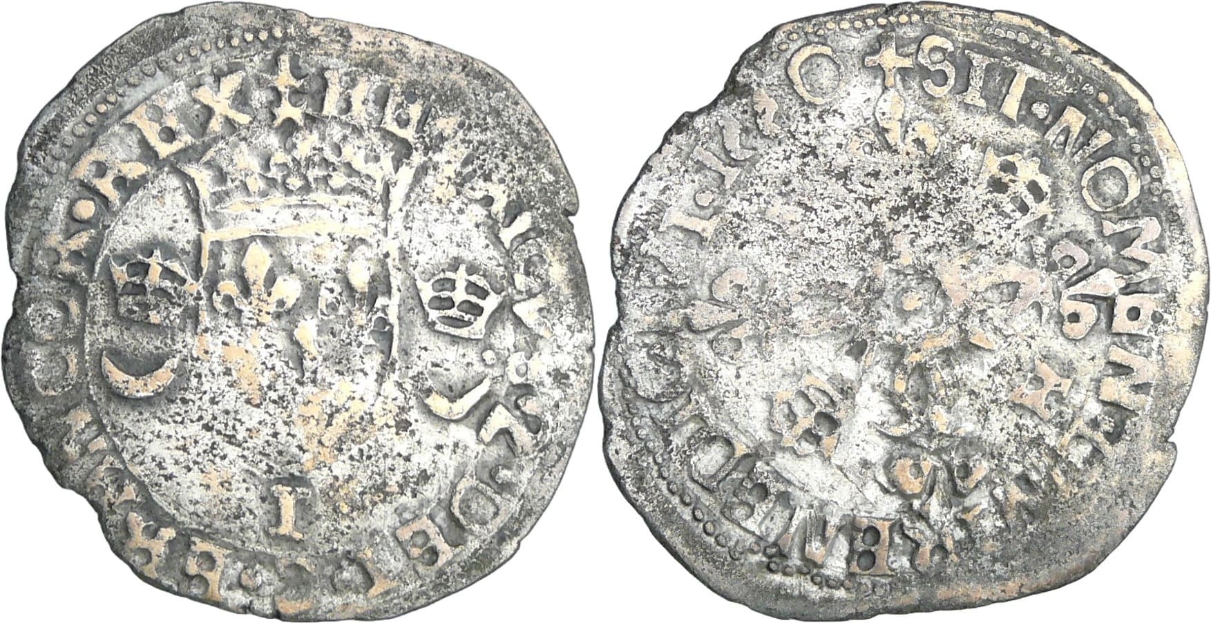 Avers : A/ HENRICVS 2 DEI G FRANCOR REX. Ecu de France accosté de deux croissants couronnés. Lettre d’atelier à la pointe de l’écu.