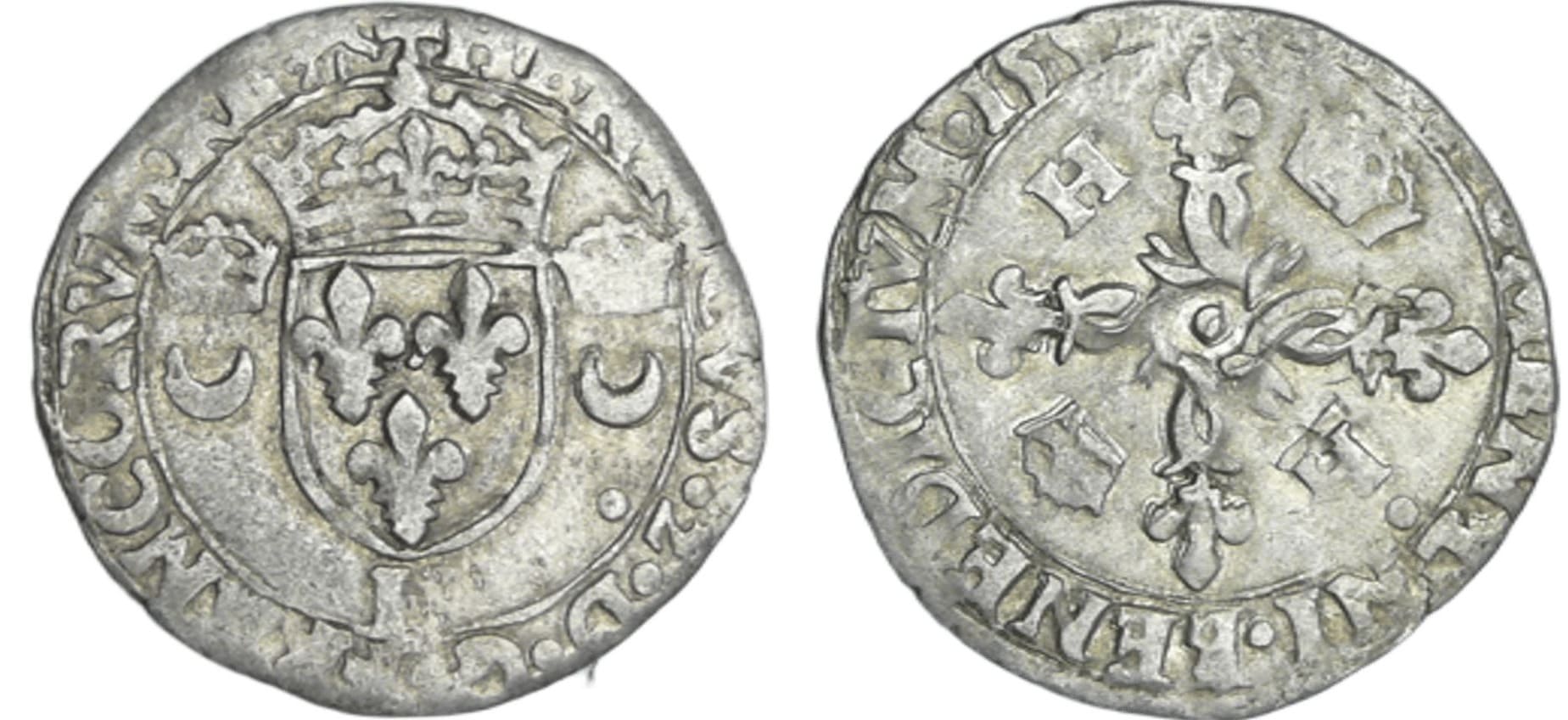 A/ HENRICVS 2 DEI G FRANCOR REX. Ecu de France accosté de deux croissants couronnés. Lettre d’atelier à la pointe de l’écu.