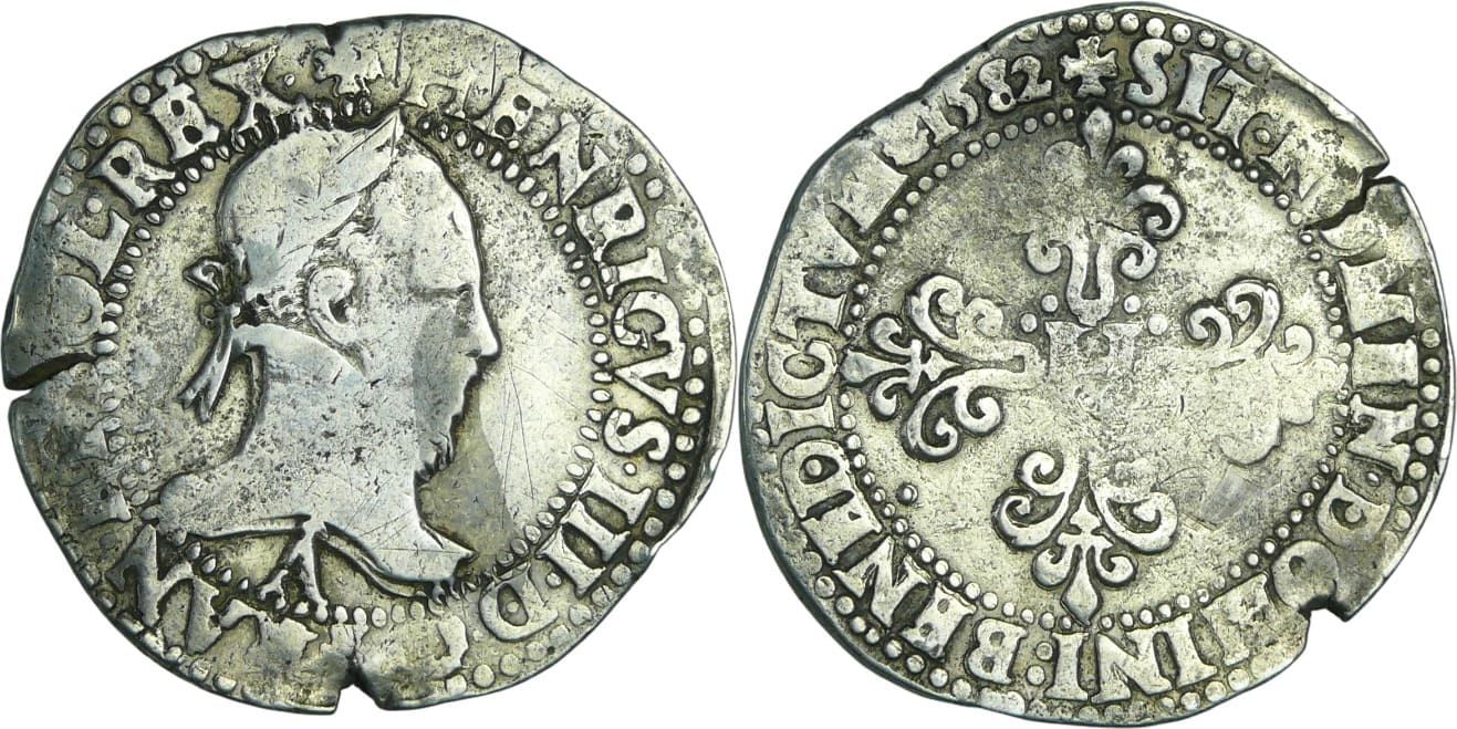 Avers : A/ + HENRICVS. III. D. G. FRAN. ET. POL. REX Buste lauré et cuirassé à droite, au col plat. Lettre d’atelier sous le buste.
