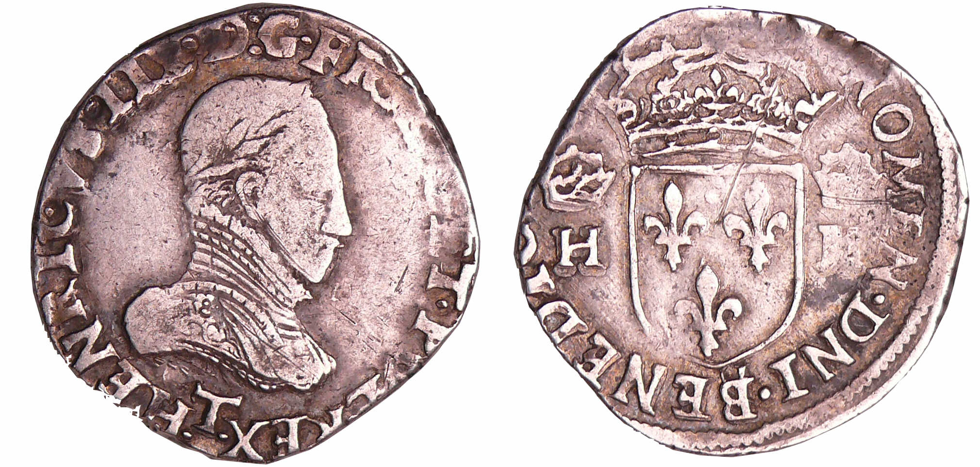 R/ + SIT NOMEN DOM BENEDIC. Ecu de France couronné et accosté de deux H couronnés.