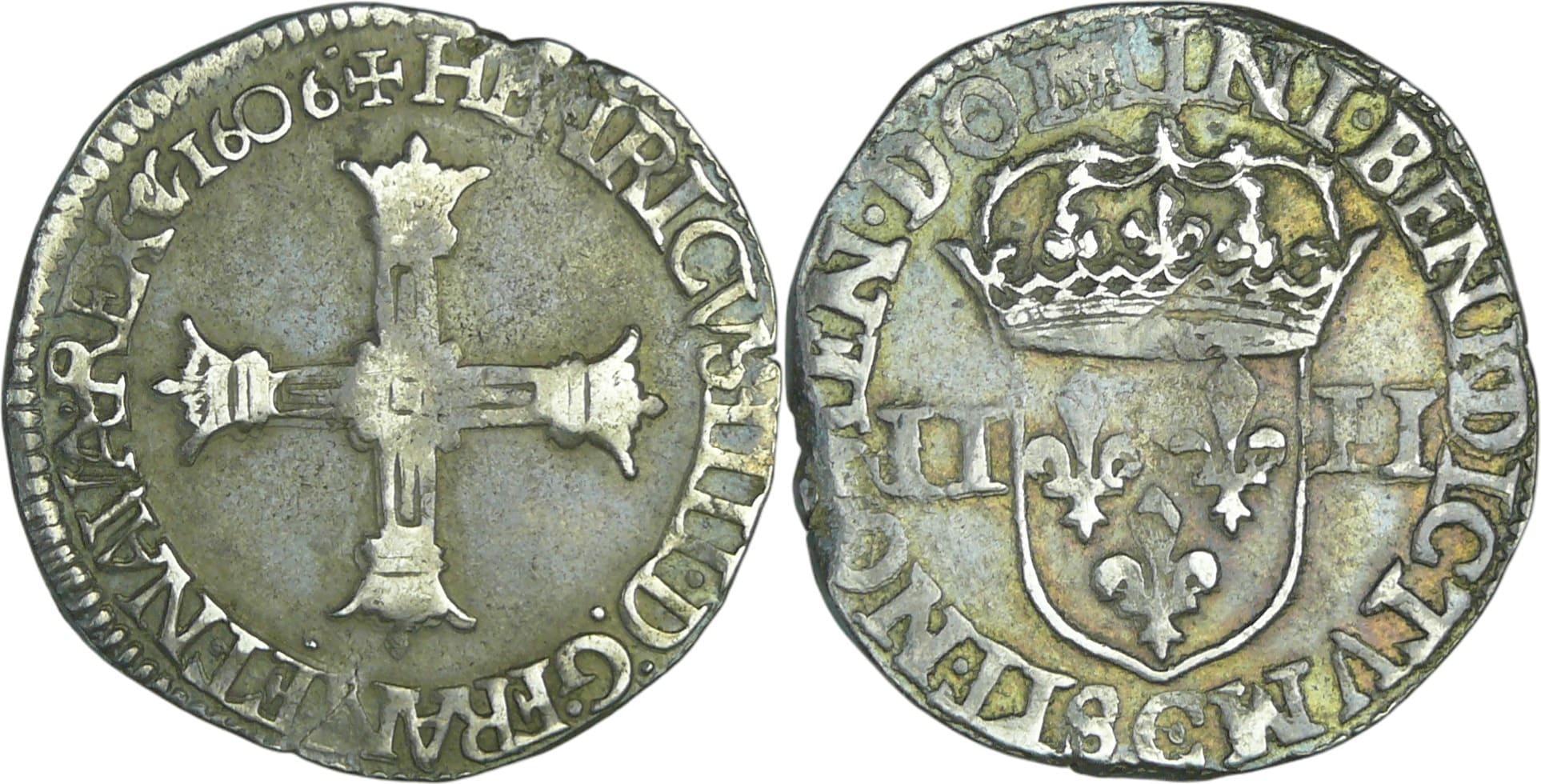 France – Henri IV (1589-1610) – Quart d’écu à la croix bâtonnée couronnée – 1606 C (Saint-Lô)