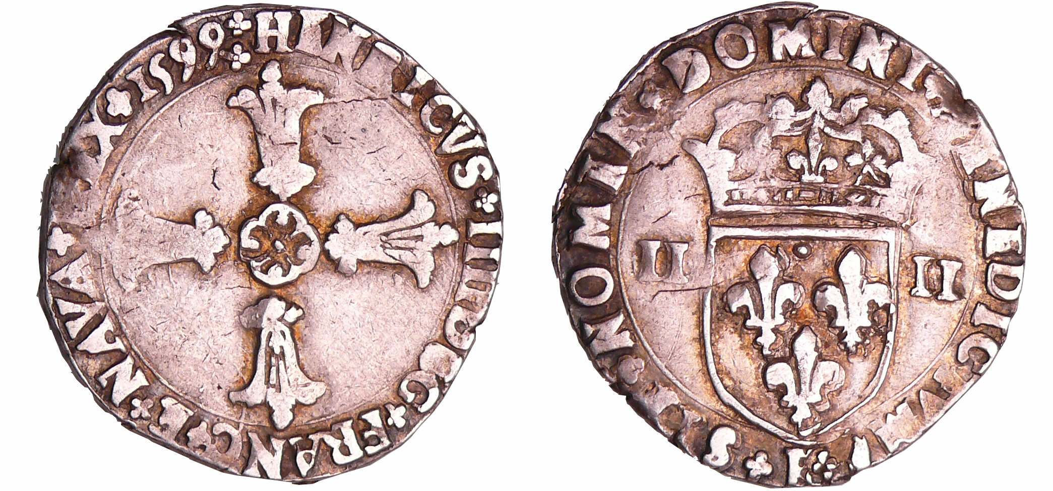 France – Henri IV (1589-1610) – Quart d’écu à la croix feuillue – 1599 K (Bordeaux)