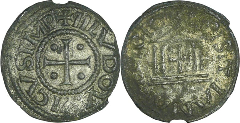 Avers : A/ + HLVDOVVICVS IMP. Croix cantonnée de quatre globules.