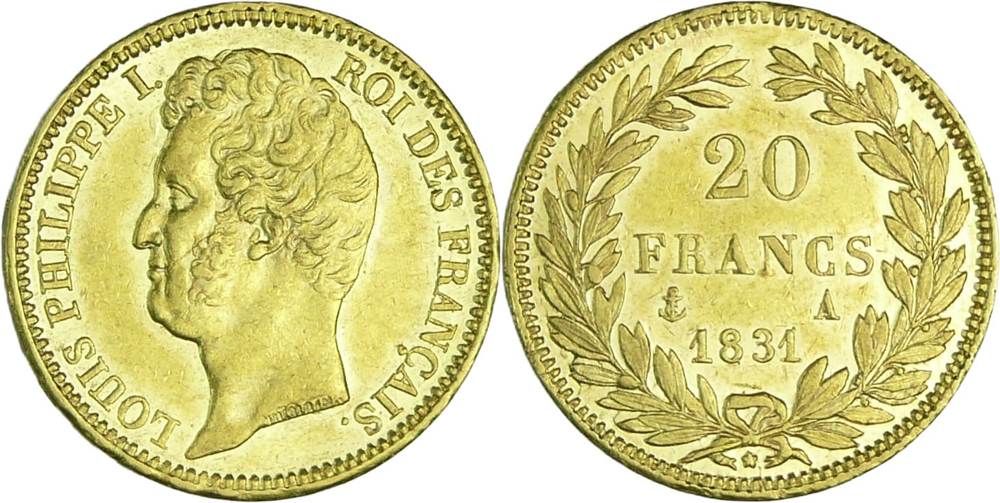 France – Louis-Philippe Ier (1830-1848) – 20 francs tête nue tranche en creux 1831 A (Paris)