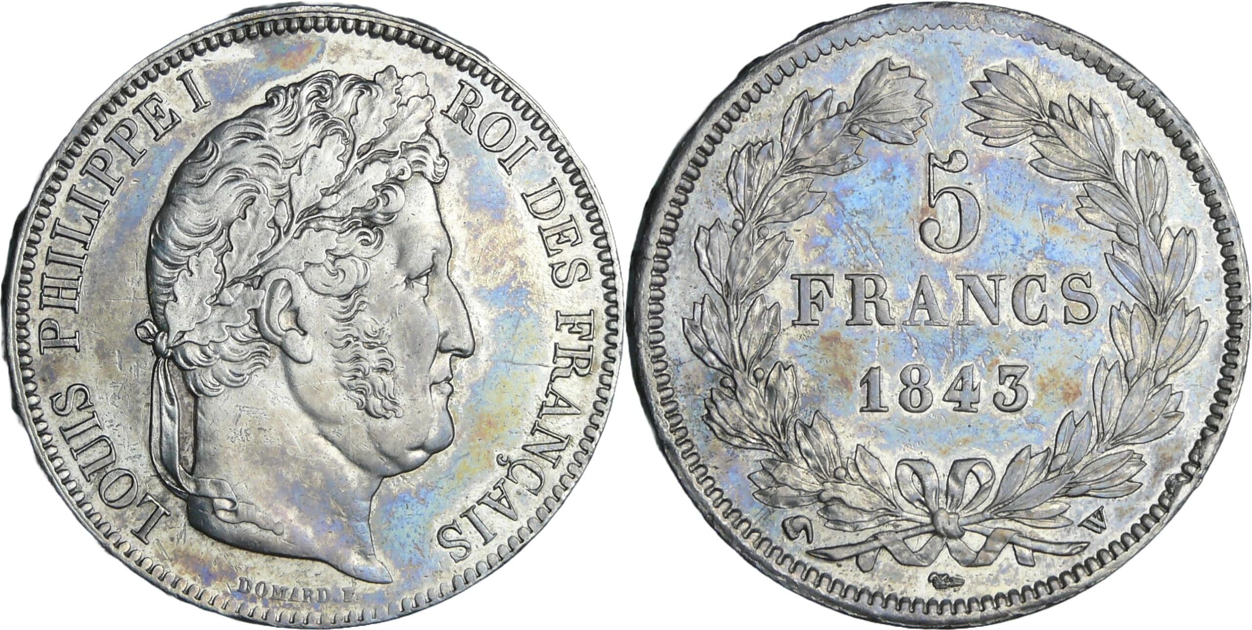 France – Louis-Philippe Ier (1830-1848) – 5 francs tête laurée 3ème type 1843 W (Lille)