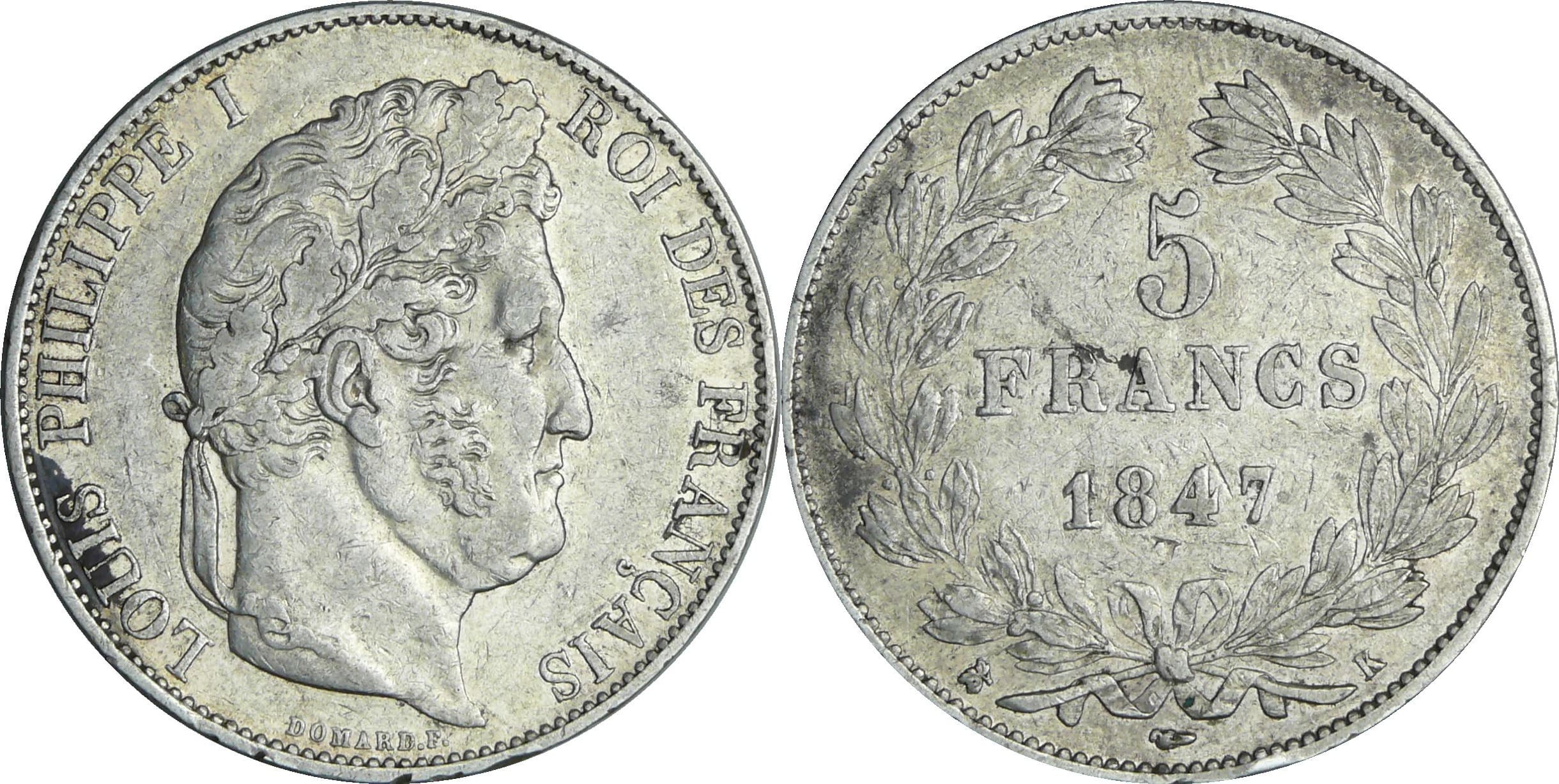 / France – Louis-Philippe Ier (1830-1848) – 5 francs tête laurée 3ème type 1847 K (Bordeaux)