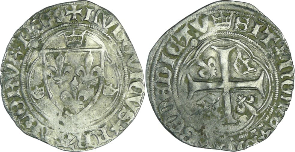 Observation : Semble inédit, associant l’avers du blanc à la couronne à l’avers (croisette en début de légende) et le revers du blanc au soleil (couronne en début de légende). Point 18ème avers et revers.