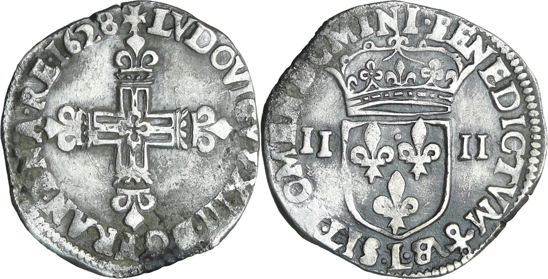 France – Louis XIII (1610-1643) – ¼ d’écu à la croix fleurdelisée, avers côté croix – 1628 L (Bayonne)