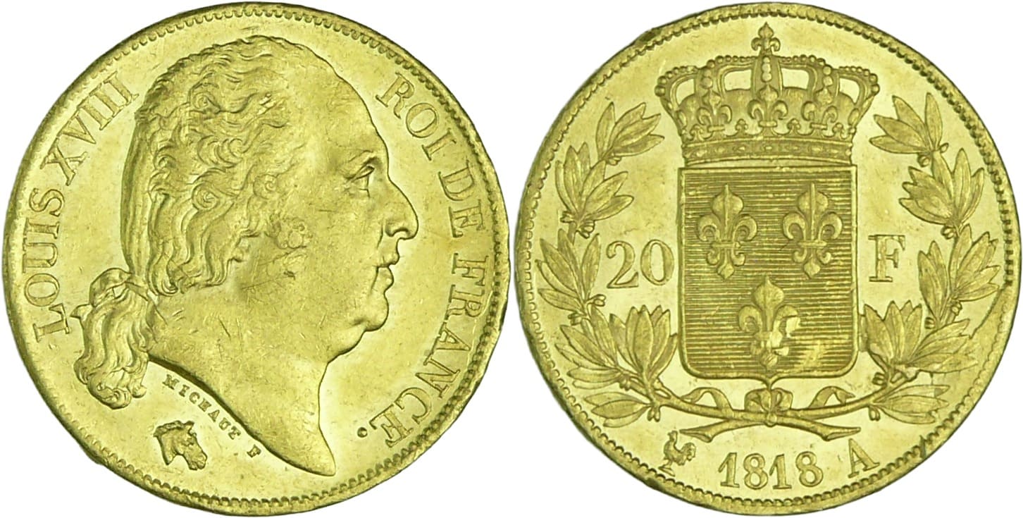 France – Louis XVIII (1815-1824) – 20 francs au buste nu 1818 A (Paris)