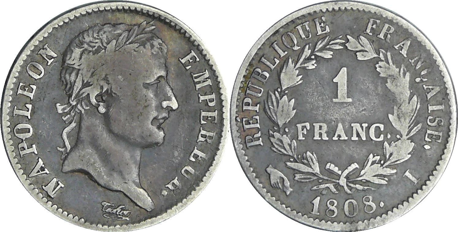 / France – Napoléon 1er (1804-1814) – 1 franc revers république 1808 I (Limoges)