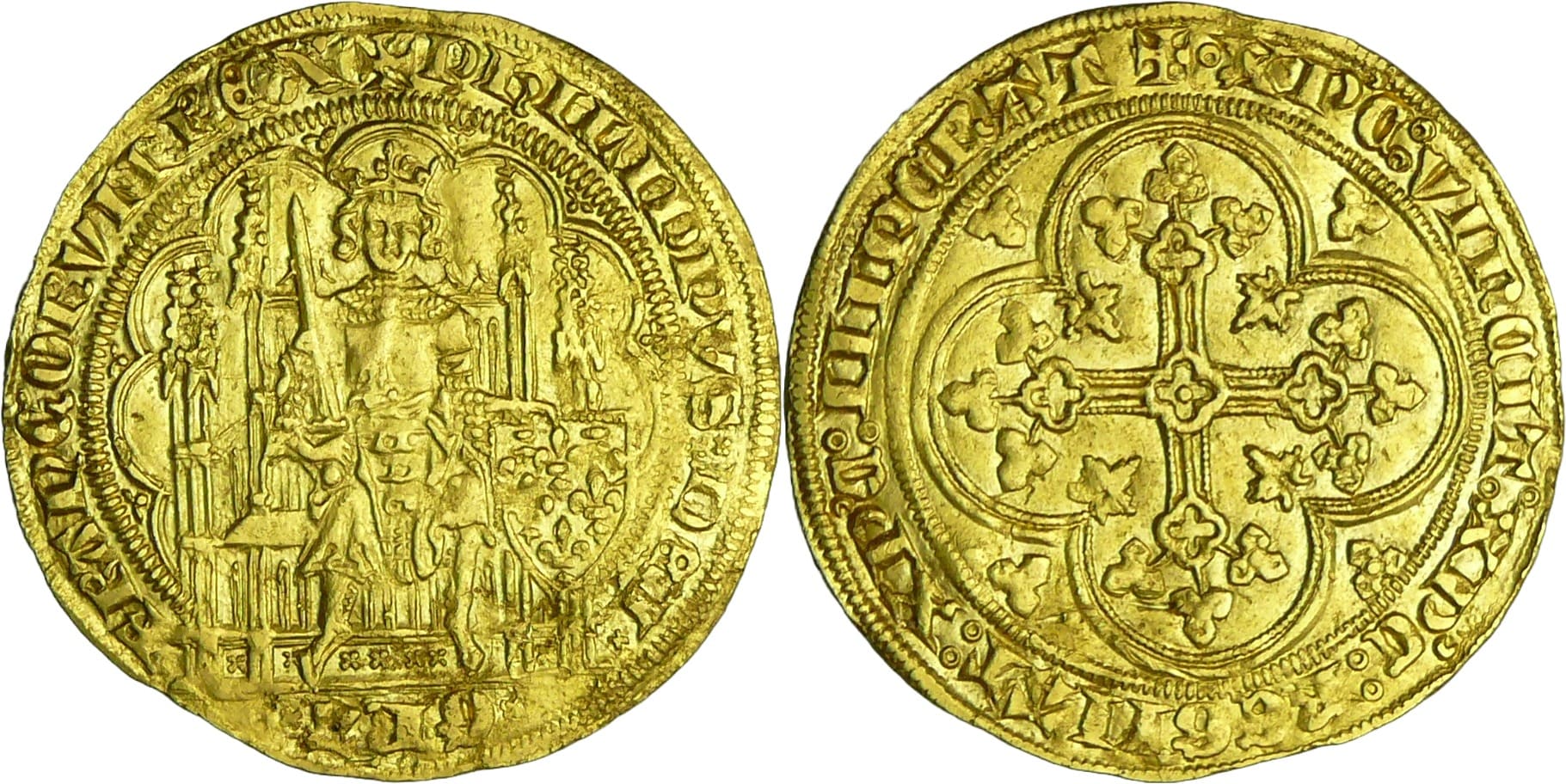A/ + PHILIPVS DEI GRA FRANCORVM REX. Le roi couronné assis dans une stalle gothique et tient l’épée et l’écu de France.
