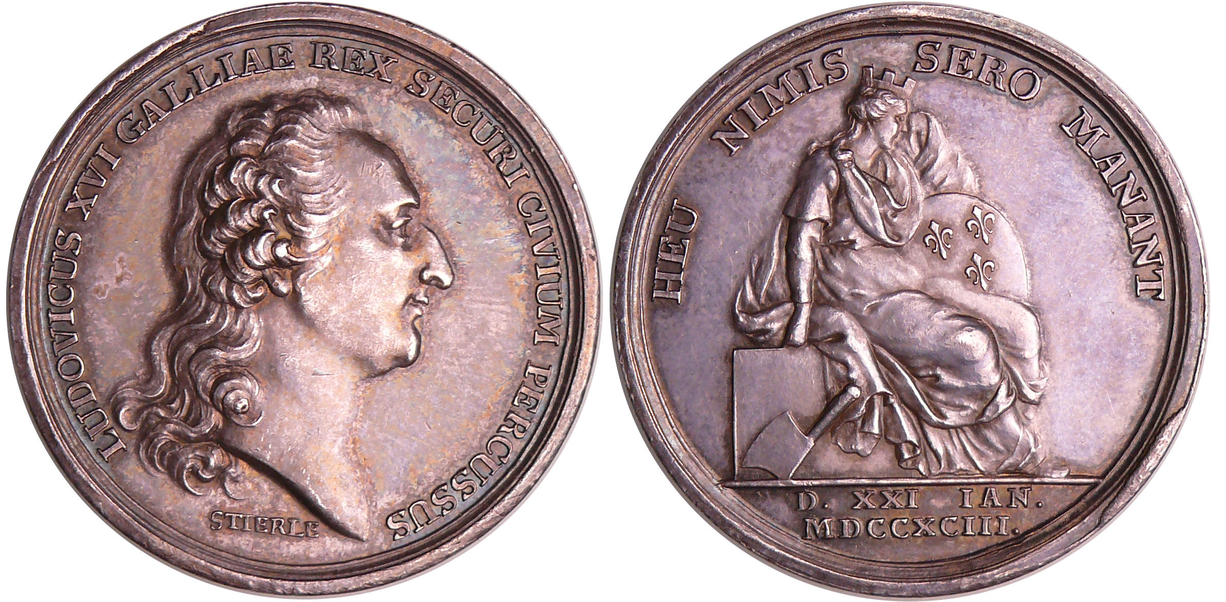 / France – Révolution – Médaille décapitation de Louis XVI, La ville de Paris affligée, assise à droite, 1793