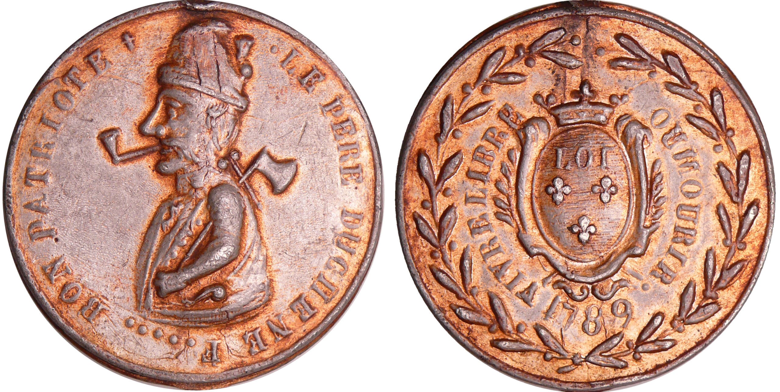 / France – Révolution – Médaille populaire au portrait du père Duchêne, personnage imaginaire s’insurgeant contre les injustices, emblème du journal quotidien du même nom, 1789