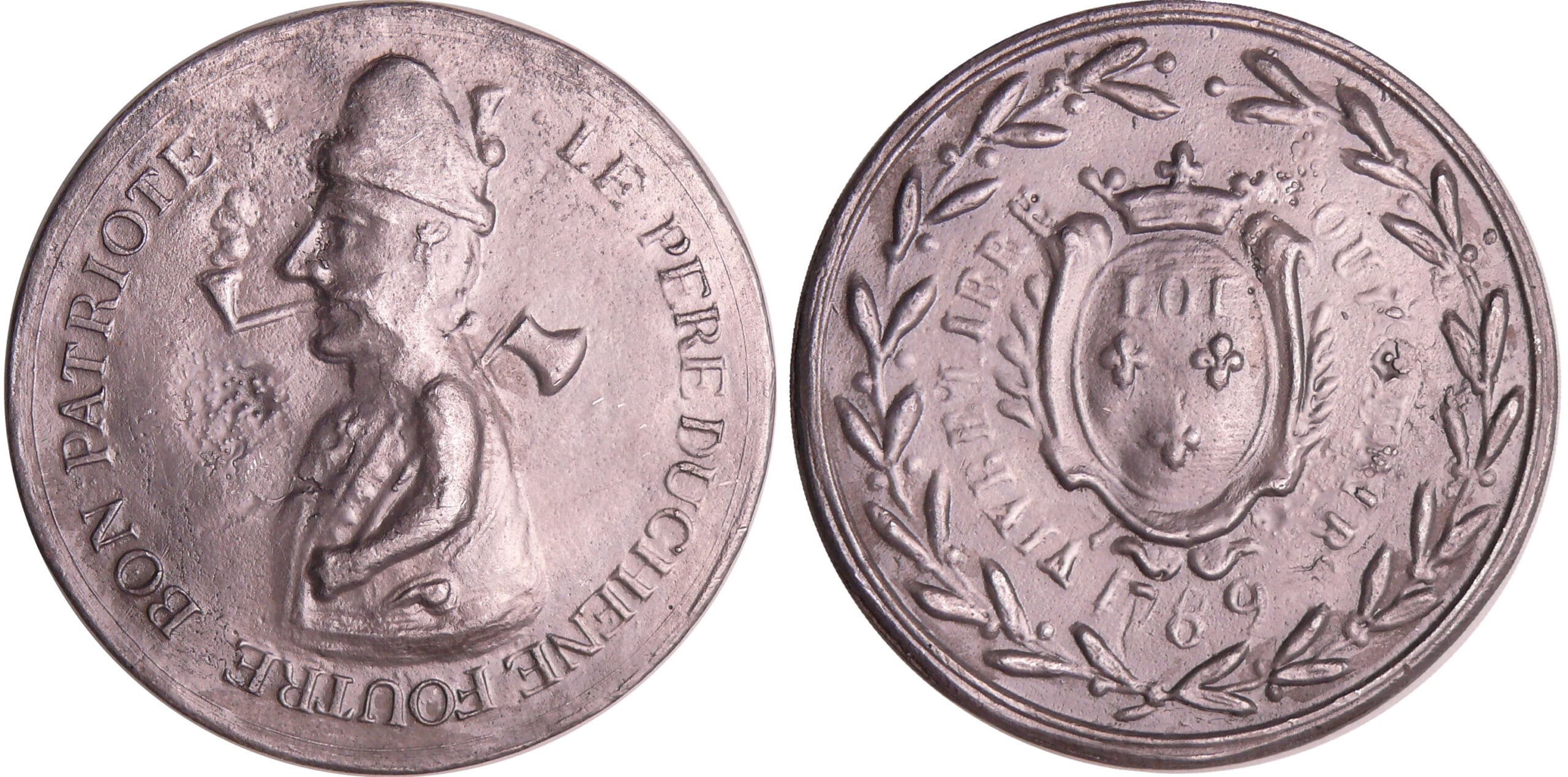 / France – Révolution – Médaille populaire au portrait du père Duchêne, personnage imaginaire s’insurgeant contre les injustices, emblème du journal quotidien du même nom, 1789