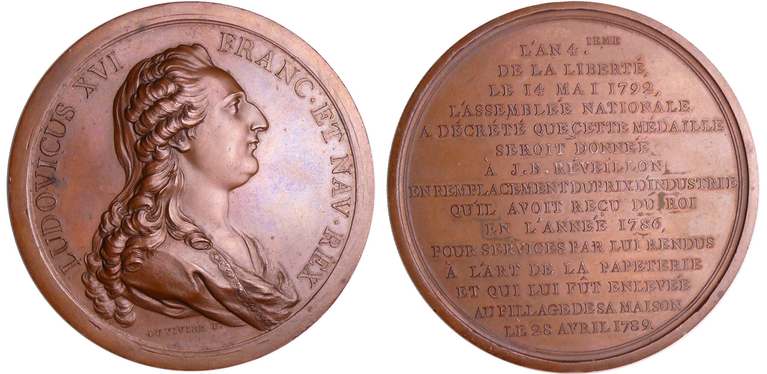 France – Révolution – Médaille pour le fabricant de papier J. B. Réveillon en remplacement de la médaille du mérite, qu’il a perdue dans le pillage de sa maison en 1789