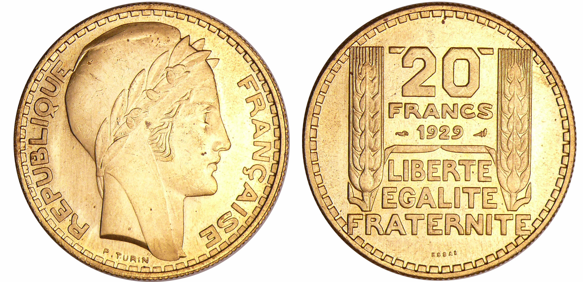 / France – Troisième république (1871-1940) – 20 francs Turin 1929 essai en bronze aluminium