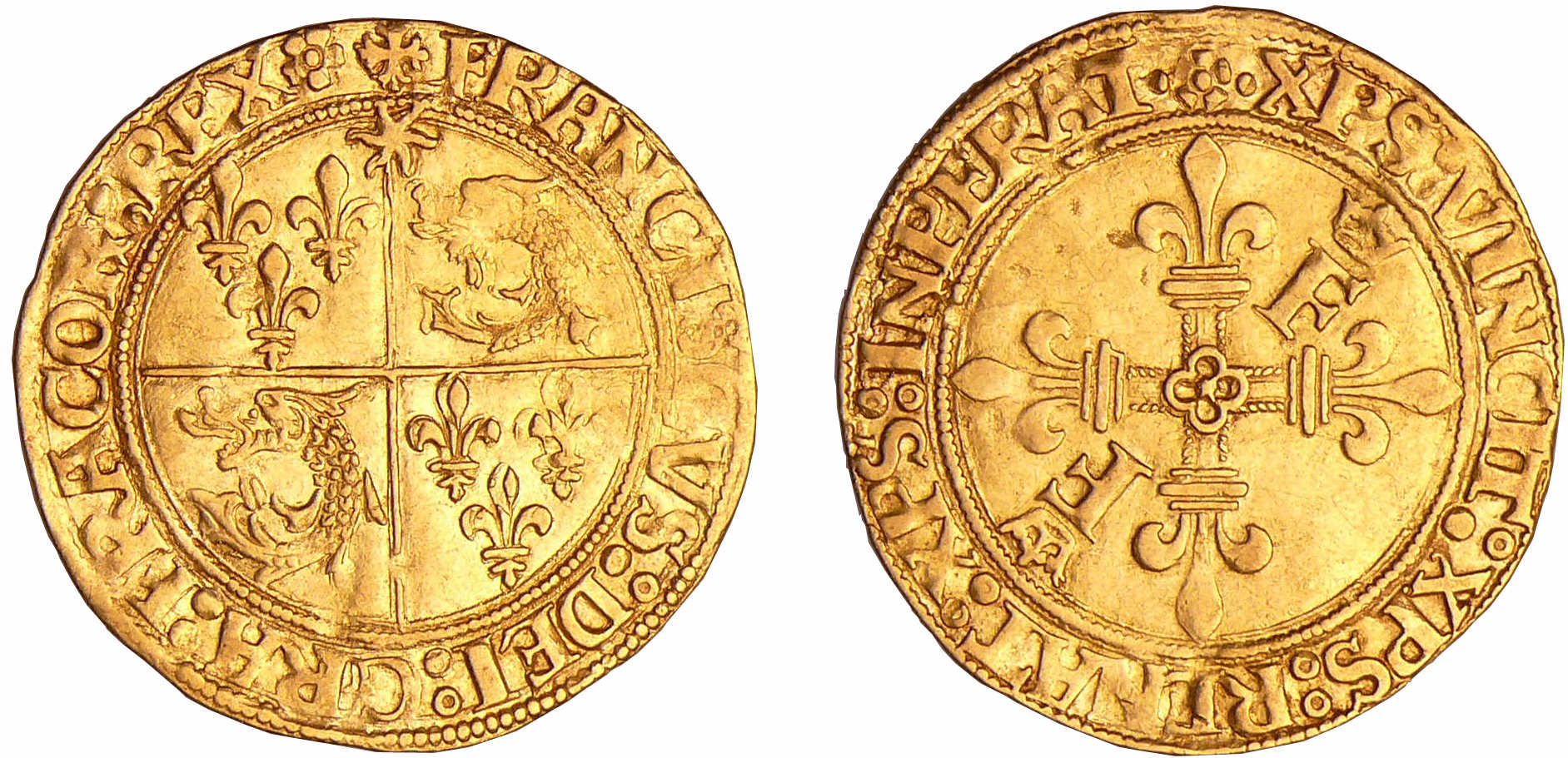 Avers : A/ ( rose) FRANCISCVS : DEI : GRA : FRACOR : REX :E. Champ écartelé surmonté d’un soleil, aux 1er et 4ème de France, aux 2ème et 3ème de Dauphiné.