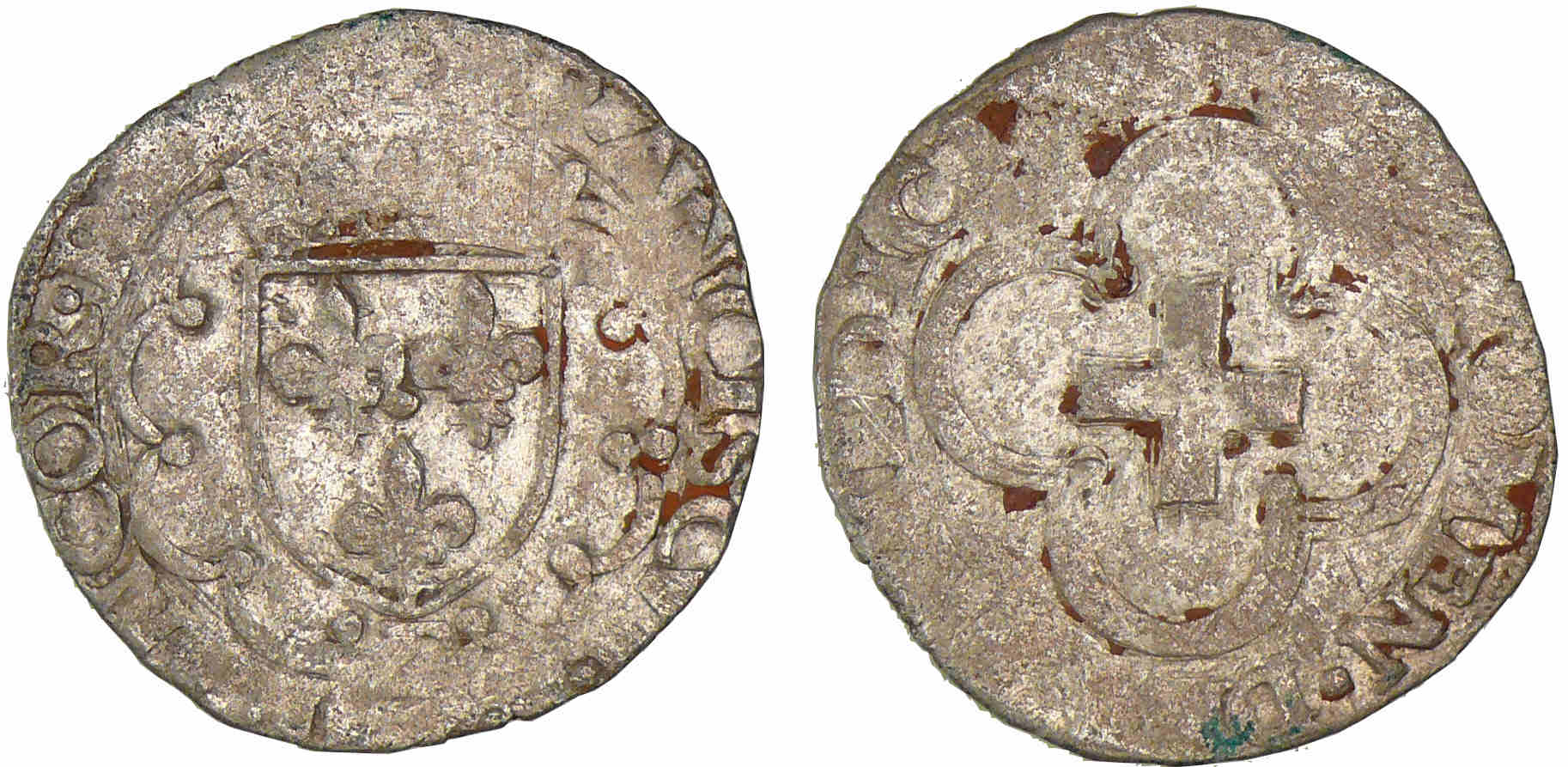 Avers : A/+ FRANCISCVS: DEI: GRA: FRANCORVM: REX. Ecu de France dans un double polylobe bouleté. Lettre d’atelier à la pointe de l’écu.